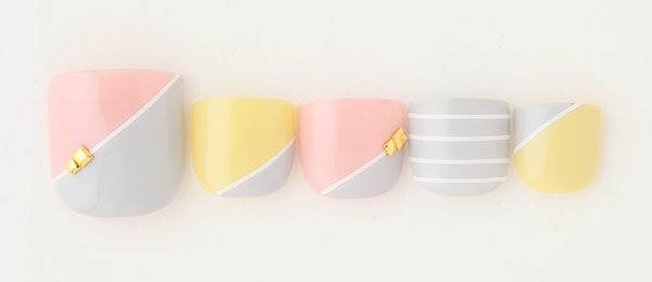 反対色を合わせた色遊びが楽しいデザイン。シンプルなサンダルも、たちまちモードな足元に。