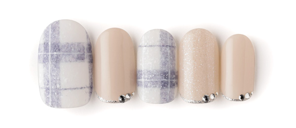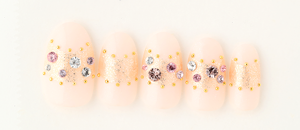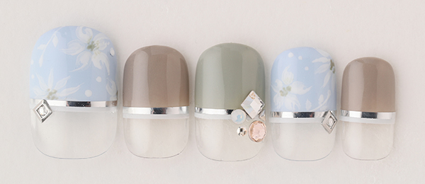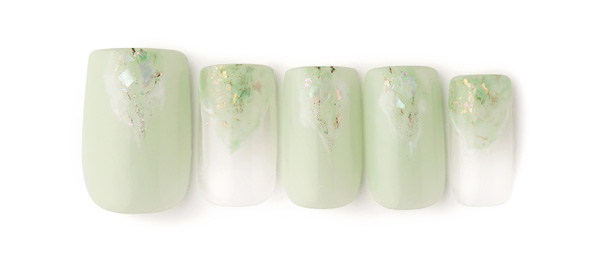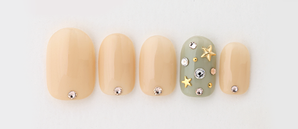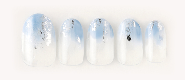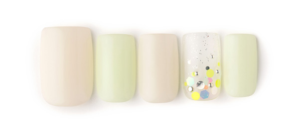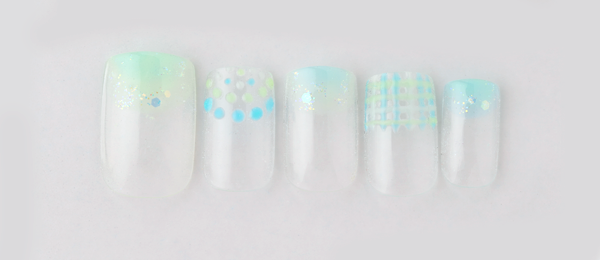 アクアブルーはベージュを合わせて大人の雰囲気に。クリアのラメで抜け感を出し、ホロドットをちりばめて涼しげな雰囲気に。