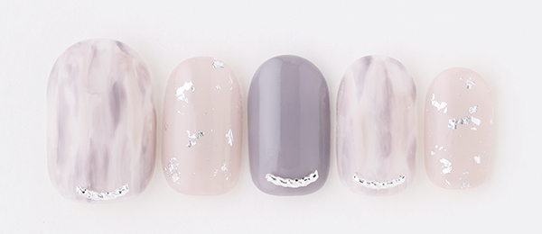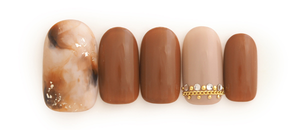 肌馴染みのいいグレージュをマットにして冬らしく。白のマーブルは雪のイメージ。雪リースみたいなビジューをポイントに。
